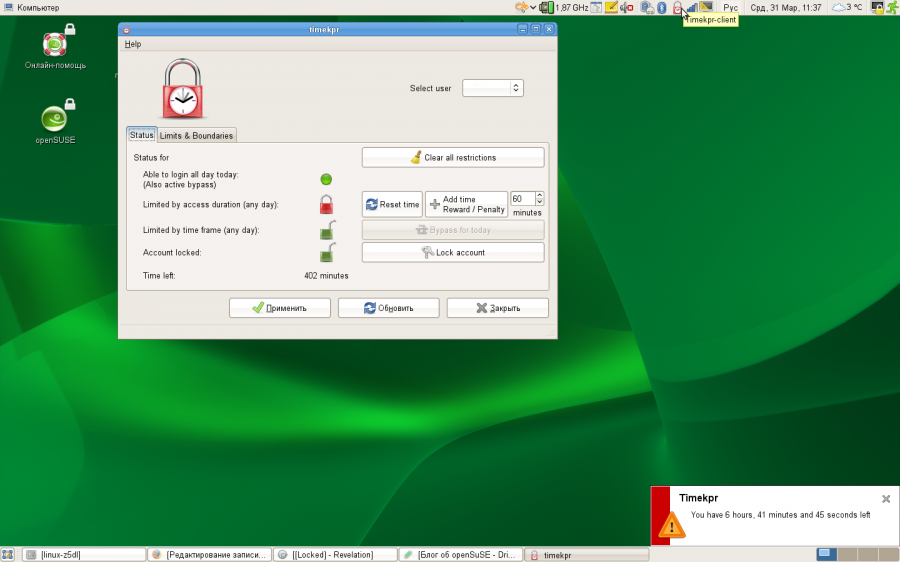 Теперь у вас есть полноценная система огранчения времени работы за компьютером, респект разработчикам timekpr'a!